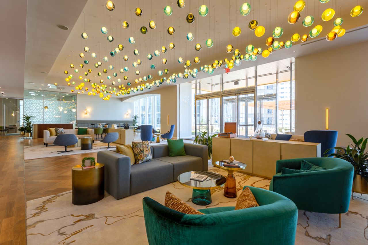 休斯頓德州大廈的休閒區採用"住宅商業化"設計理念,呈現客廳般的視覺效果。圖片來源:Hines由海因斯集團開發的47層辦公樓德州大廈位於休斯頓市中心,其配備沙發、扶手椅、腳凳和咖啡桌的休閒區充滿居家感。主要租户包括海因斯集團、國際律所Vinson & Elkins LLP以及切尼爾能源。