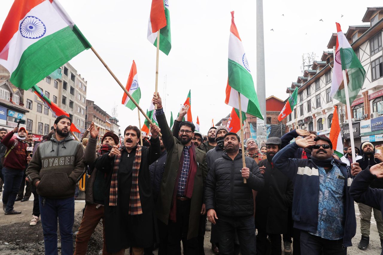1月26日,印度斯利那加,印度人民黨領導人和支持者在共和國日慶祝活動中揮舞印度國旗。圖片來源:farooq khan/Shutterstock刊載於2023年2月24日印刷版,原標題為《印度試圖監管宗教皈依》。