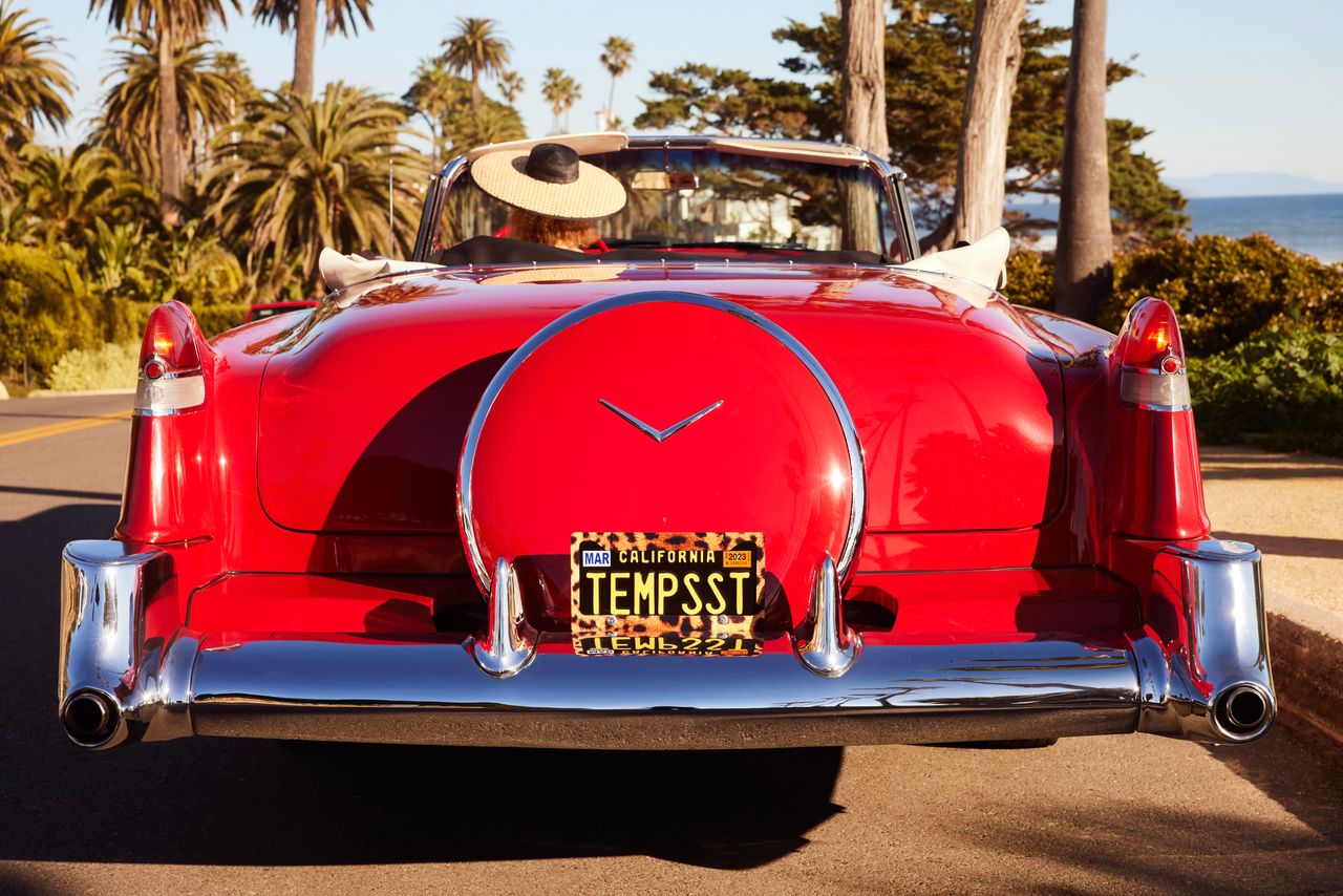 2017年,當Eldorado被大卡車運抵的那天,我不禁驚呼:“天啊!”它體型龐大,且保存得近乎完美。車漆閃閃發光,立刻讓我想起多年前採訪過的一位著名滑稽戲明星——暴風女(Tempest Storm)。她擁有一頭紅髮,而我的車也是紅色。暴風女性格張揚大膽,總能吸引眾人目光,這輛車亦是如此。我決定以她的名字為車命名,並定製了車牌——TEMPSST。雖拼寫不完全相同,但已是最接近的選擇。
