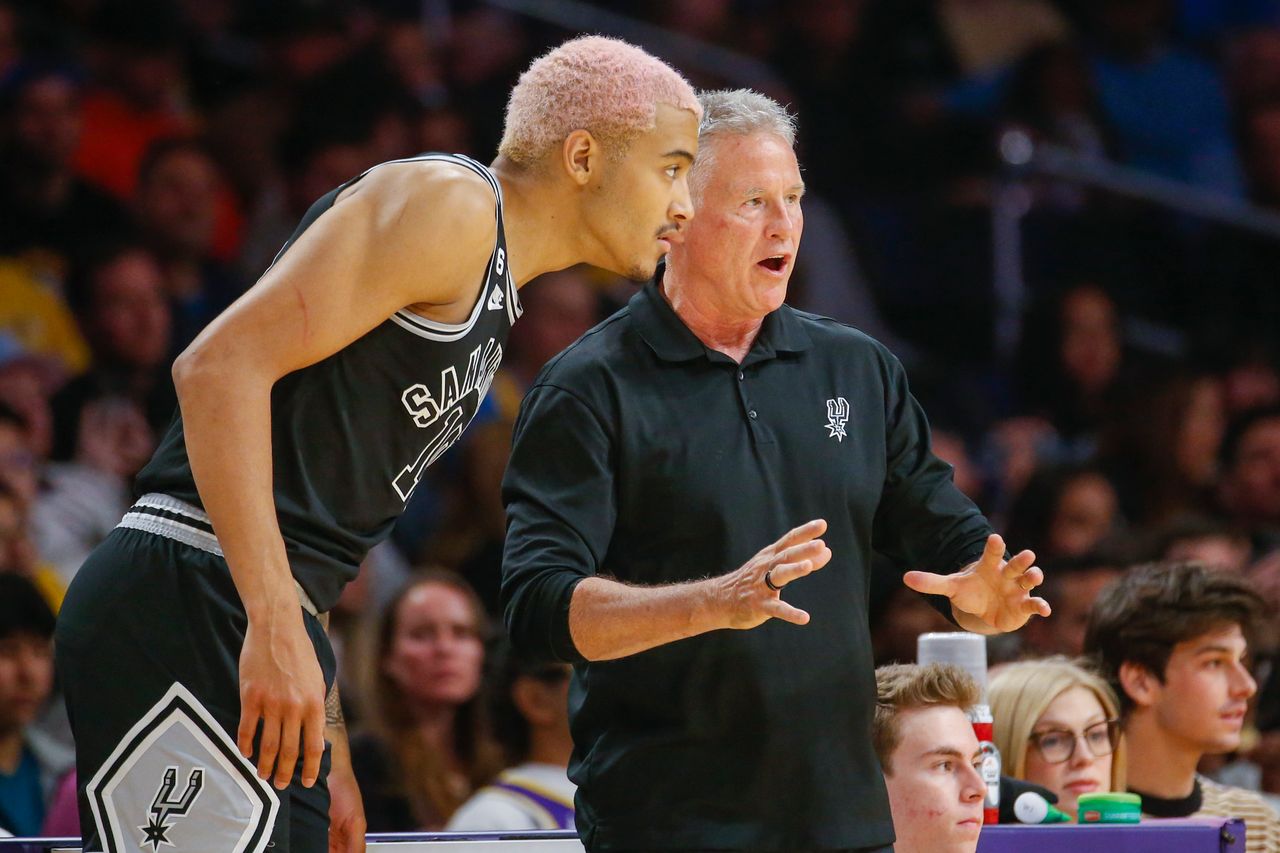 傑里米·索漢與馬刺隊教練格雷格·波波維奇交談。照片:羅納德·科爾特斯/蓋蒂圖片社索漢改進後的罰球動作模仿了賽季初布朗教練為他設計的訓練方案,旨在將投籃動作分解為多個組成部分。去掉左手迫使索漢將右臂置於球的正下方,一旦做到這一點,布朗注意到其他所有要素——平衡性、左右精準度、拋物線——都完美契合。