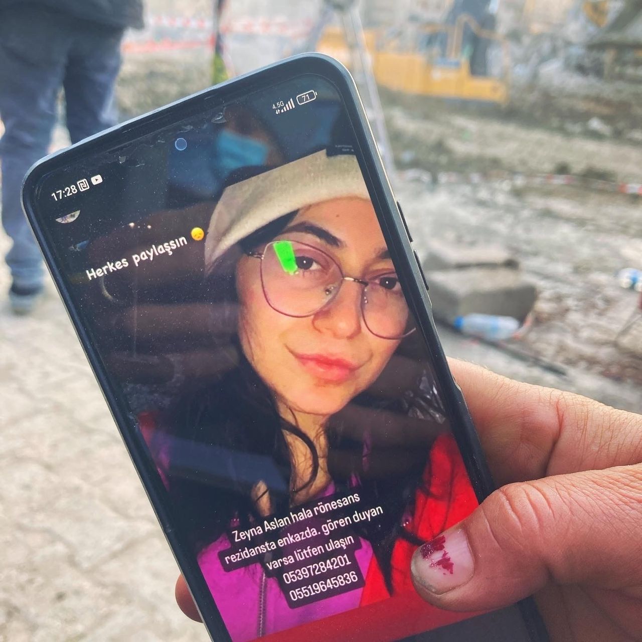 23歲的澤娜·阿斯蘭自安塔基亞羅內桑斯公寓在地震中倒塌後一直失蹤。照片:Sune Rasmussen/華爾街日報首次7.8級地震摧毀了羅內桑斯大樓,將這座擁有249個單元的住宅區變為墳墓。約一週後,帶着搜救犬的隊伍撤離,重型機械進場,當局的工作重點從搜尋遺體轉向清理廢墟。