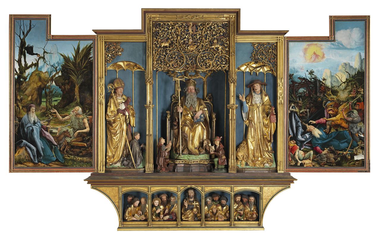 這兩幅畫作與哈格瑙的尼古拉斯(約1445/1460-1538年前)創作的鍍金雕塑相鄰,雕塑呈現祭壇核心處的聖安東尼、聖奧古斯丁和聖傑羅姆。這些早於格呂內瓦爾德畫作的雕塑雖工藝紮實,但相較之下並無特別之處。