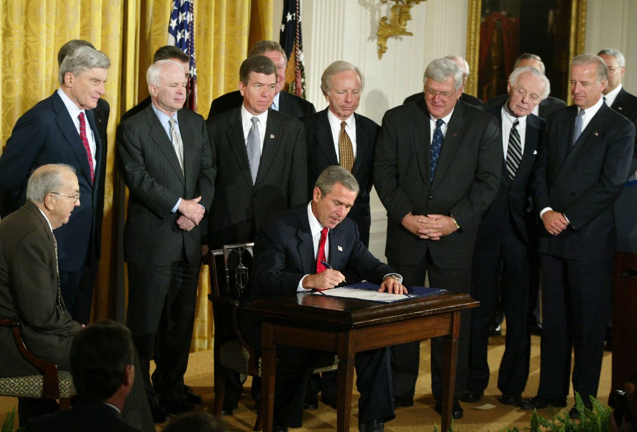 2002年,喬治·W·布什總統簽署授權對伊拉克使用武力的法案。圖片來源:Mark Wilson/Getty Images華盛頓——二十年前,美國國會參眾兩院投票授權喬治·W·布什總統對伊拉克使用武力。