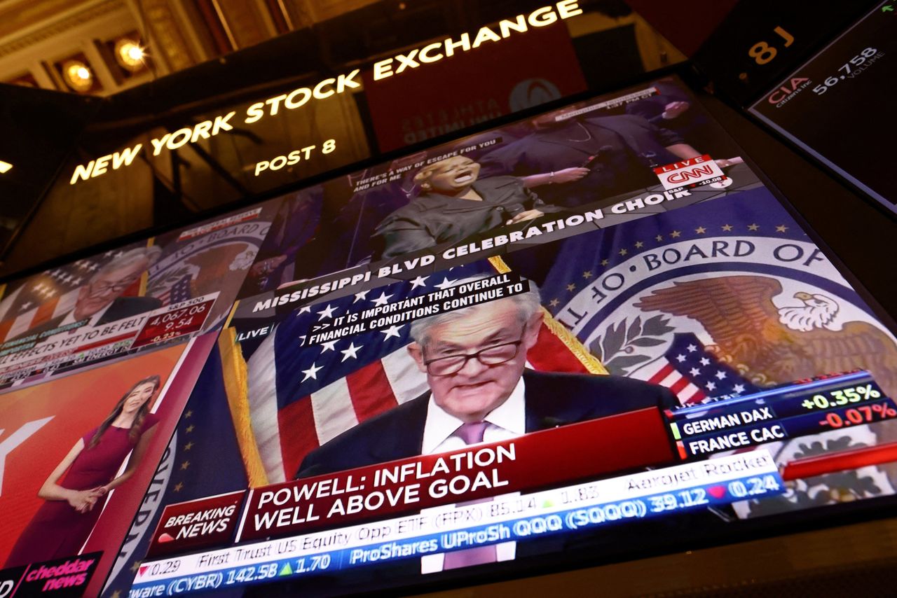 2月1日,紐約證券交易所交易大廳屏幕上顯示的美聯儲主席傑羅姆·鮑威爾。圖片來源:ANDREW KELLY/REUTERS刊載於2023年3月21日印刷版,標題為《美聯儲屢犯的錯誤》。