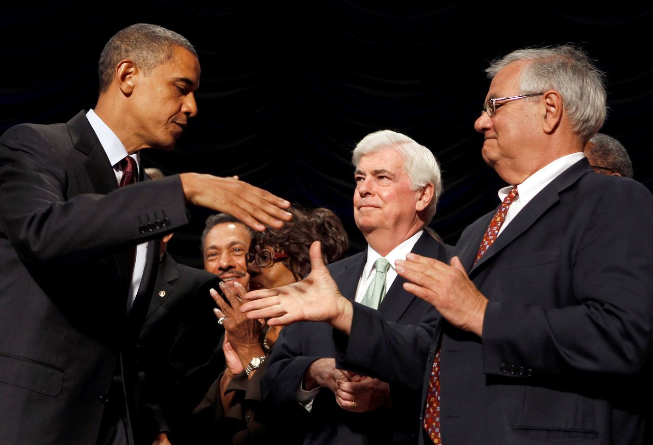 2010年,巴拉克·奧巴馬總統與《多德-弗蘭克華爾街改革和消費者保護法》的共同提案人蔘議員克里斯托弗·多德和眾議員巴尼·弗蘭克。圖片來源:拉里·唐寧/路透社錫安銀行集團(Zions Bancorp)董事長兼首席執行官哈里斯·西蒙斯當時資產規模剛超過500億美元門檻,他在2017年向參議院議員表示,他的銀行不存在"那些特大型銀行機構特有的系統性風險”。