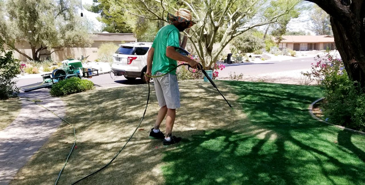 70歲的鳳凰城退休電台主持人奧齊·薩特勒每年夏季都會請專業人士為草坪噴繪,這有時會讓鄰居們大吃一驚。“因為前一天還是枯黃色,第二天就變成了鮮綠色,”他説道。