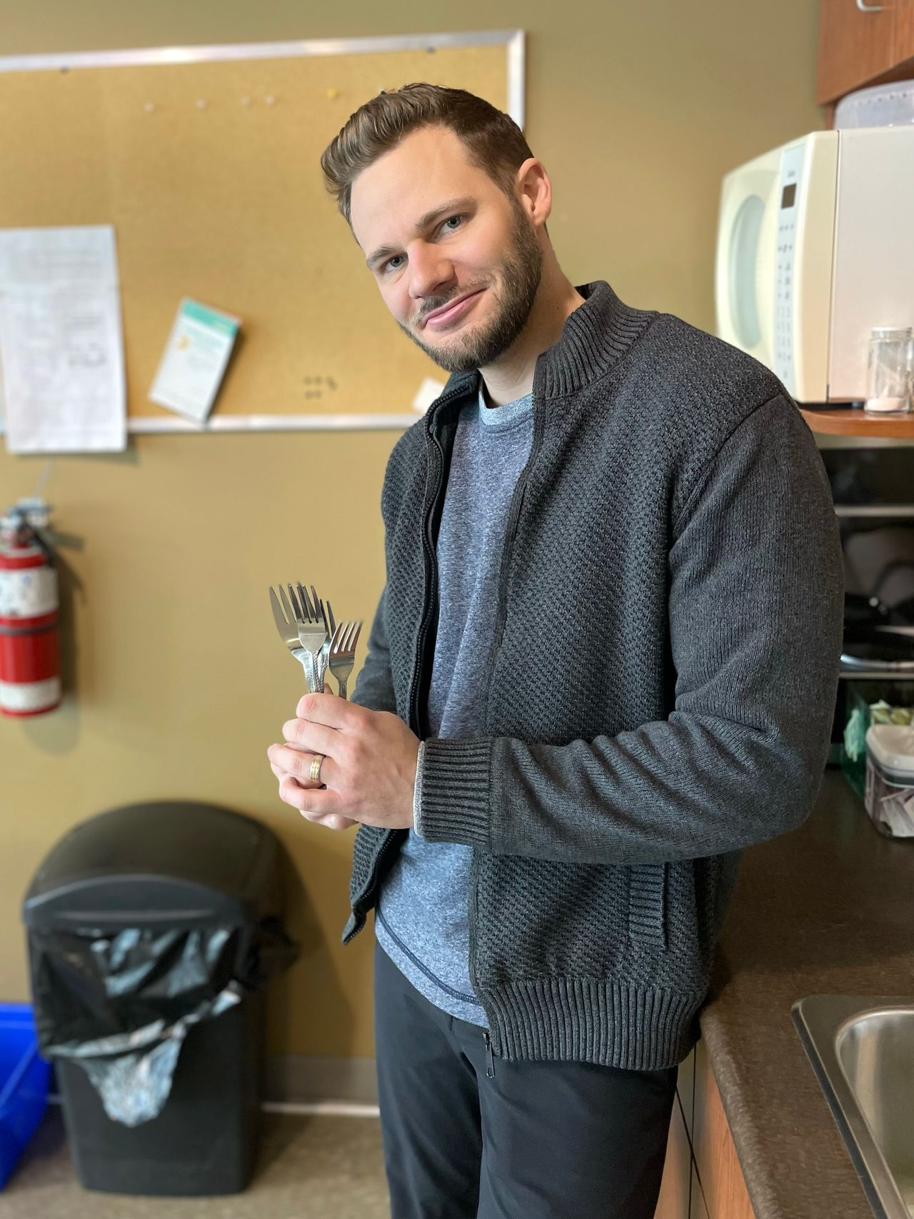 加拿大國家卡車聯盟辦公室市場總監本·斯蒂勒自稱"叉子警察"。圖片來源:本·斯蒂勒在加拿大國家卡車聯盟(該國卡車運輸業的保險經紀公司)的辦公室裏,市場總監本·斯蒂勒表示,午餐室通常只提供勺子,沒有叉子。