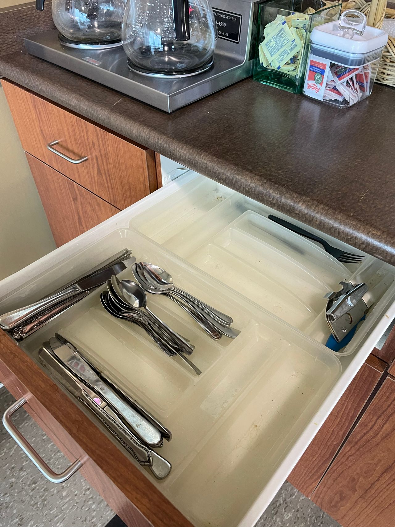 邁克爾·澤萊克用金色刀叉和湯匙補充餐具抽屜,以防止意外失竊。圖片來源:邁克爾·澤萊克新西蘭商業媒體BusinessDesk聯合創始人兼所有者帕特里克·斯梅利表示,當他的團隊與其他公司共用一個辦公空間時,他過去每六個月就要補充一次共享餐具抽屜。