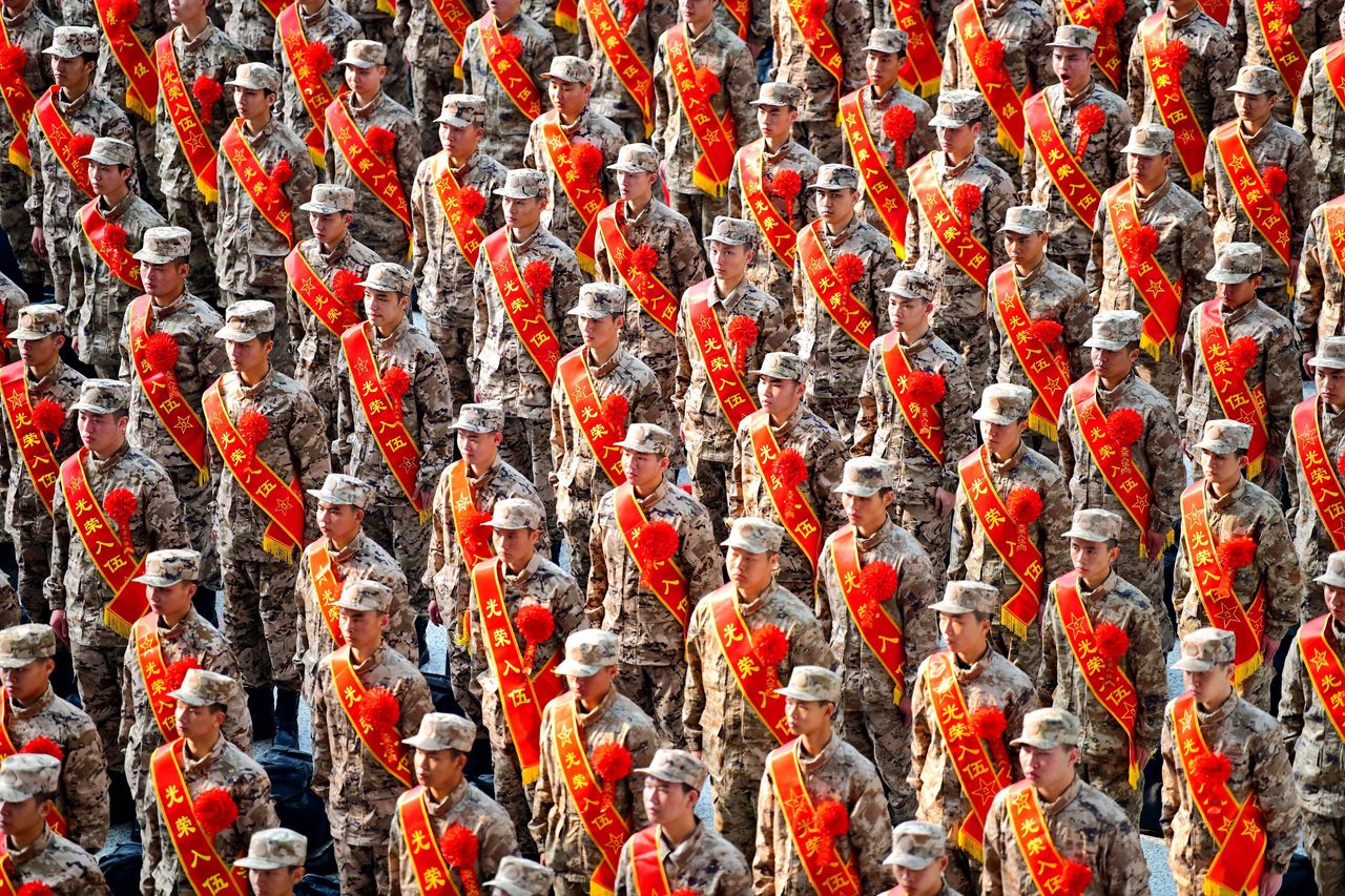 3月16日,中國軍隊在贛州市舉行新兵入伍儀式。圖片來源:中國日報/路透社刊登於2023年3月23日印刷版,標題為《中國共產黨收復台灣的A計劃》。