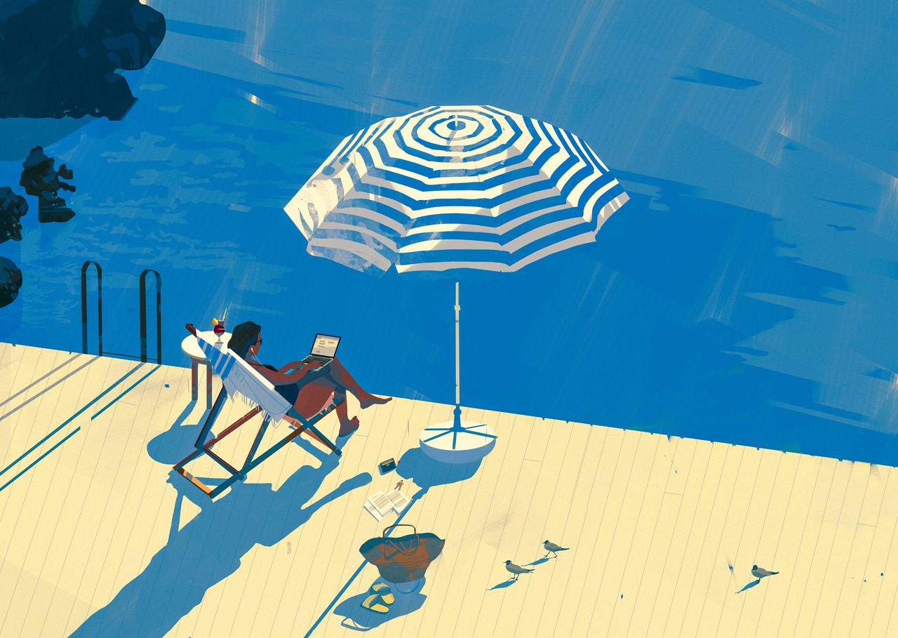 在某些情況下,增加一些遠程工作或許能讓你在度假地停留更久。插圖:達莉婭·什尼金娜我每次出差都會設法擠出時間享受個人休閒或冒險。而每次度假,我也總會抽時間處理工作。