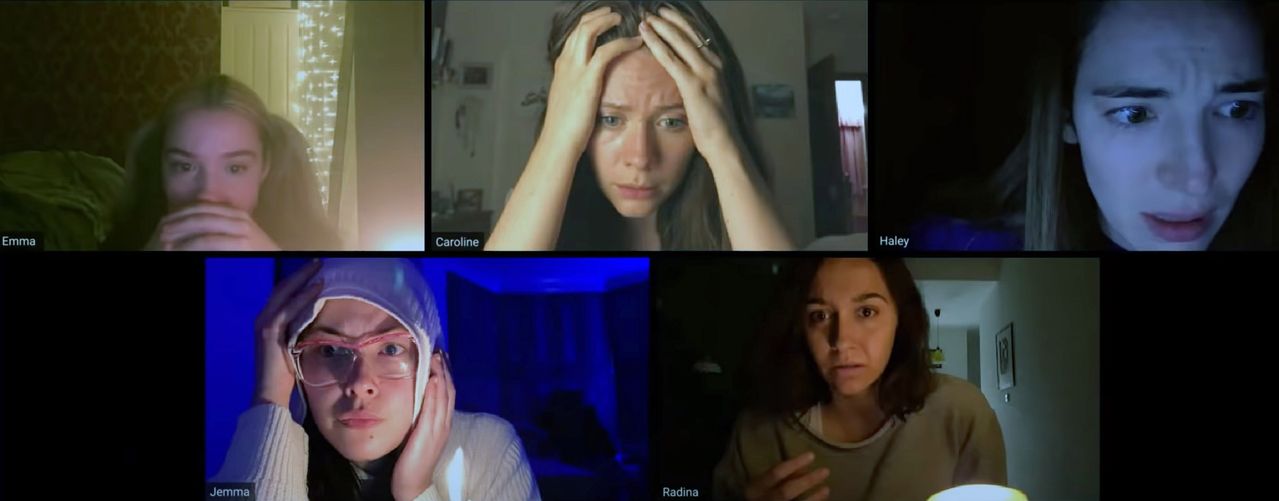 在電影《宿主》中,朋友們舉行降神會,意外招來了惡魔。圖片來源:AMC/Everett Collection根據英國互聯網服務評級公司Broadband Choices去年進行的一項研究,有史以來最恐怖的電影是三年前獨立製作的《宿主》,該片完全在新冠封鎖期間使用Zoom視頻會議軟件拍攝。