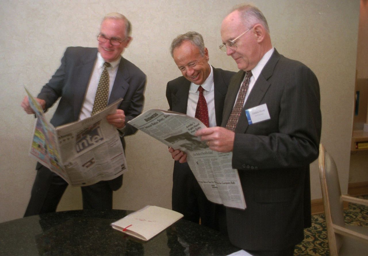 1997年英特爾股東大會上,首席運營官克雷格·巴雷特(左)、首席執行官安迪·格魯夫(中)與董事長戈登·摩爾合影。圖片來源:Paul Sakuma/Associated Press但摩爾、諾伊斯等八人因不滿肖克利的領導方式,於1957年集體離職。這個被稱為"叛逆八人幫"的團隊創立了仙童半導體公司,作為仙童攝影器材公司的子公司。摩爾帶領研發團隊最初生產晶體管,後來諾伊斯提出了在硅片上集成多個元件製造芯片的構想。