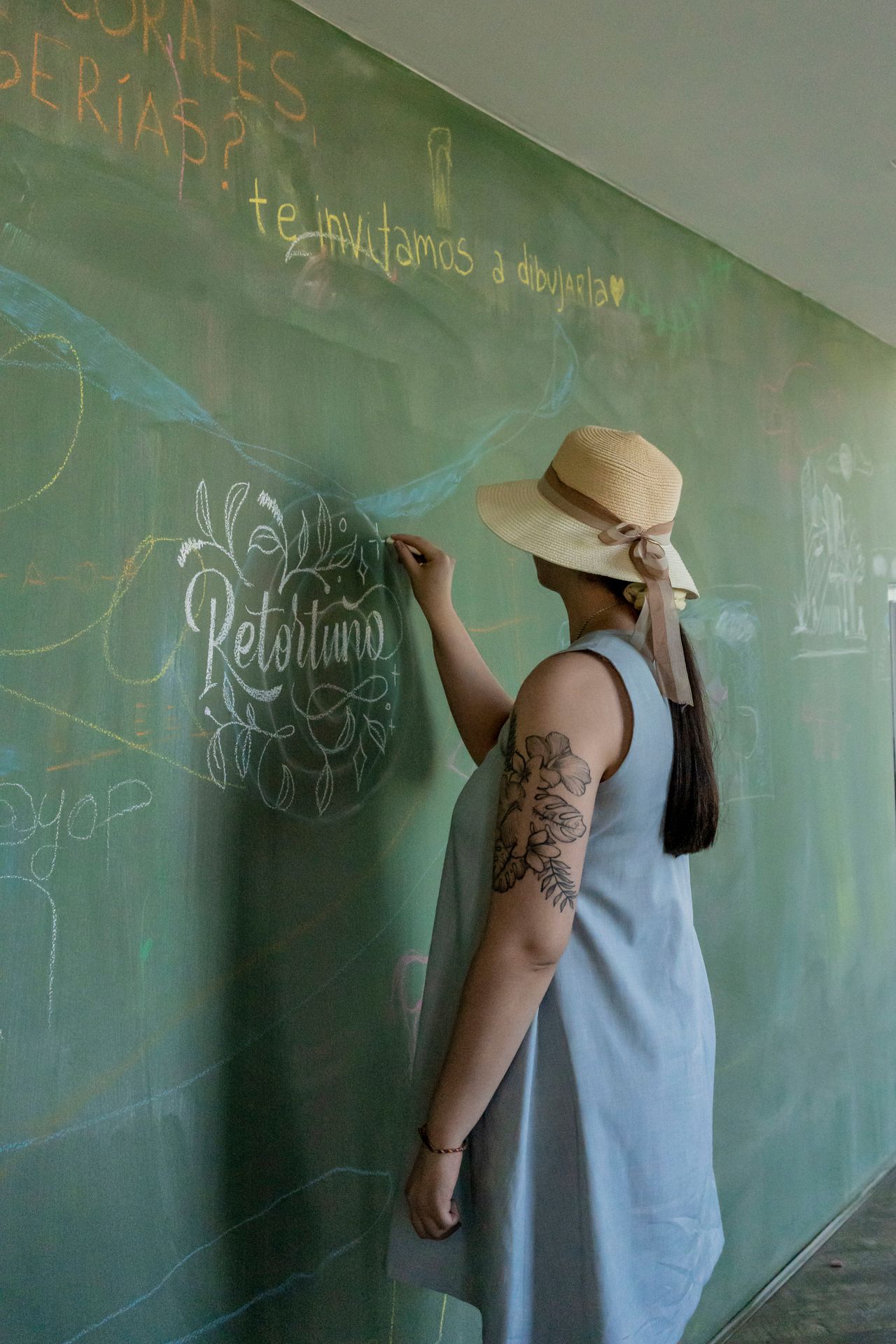 一位女士在普羅阿基金會黑板上作畫。### 畫廊主:奧利·本扎卡