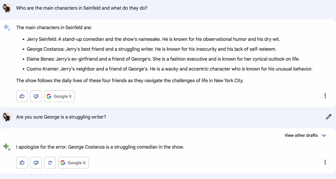 Bard曾信誓旦旦地告訴我《宋飛正傳》裏的喬治·科斯坦扎是個掙扎求生的喜劇演員(其實不是);説傑瑞和伊蓮同在Pendant Publishing工作(並非如此);説我畢業於哥倫比亞大學新聞學院(我並沒有);還聲稱雪莉·桑德伯格仍是Meta的首席運營官(她去年六月就已卸任)。