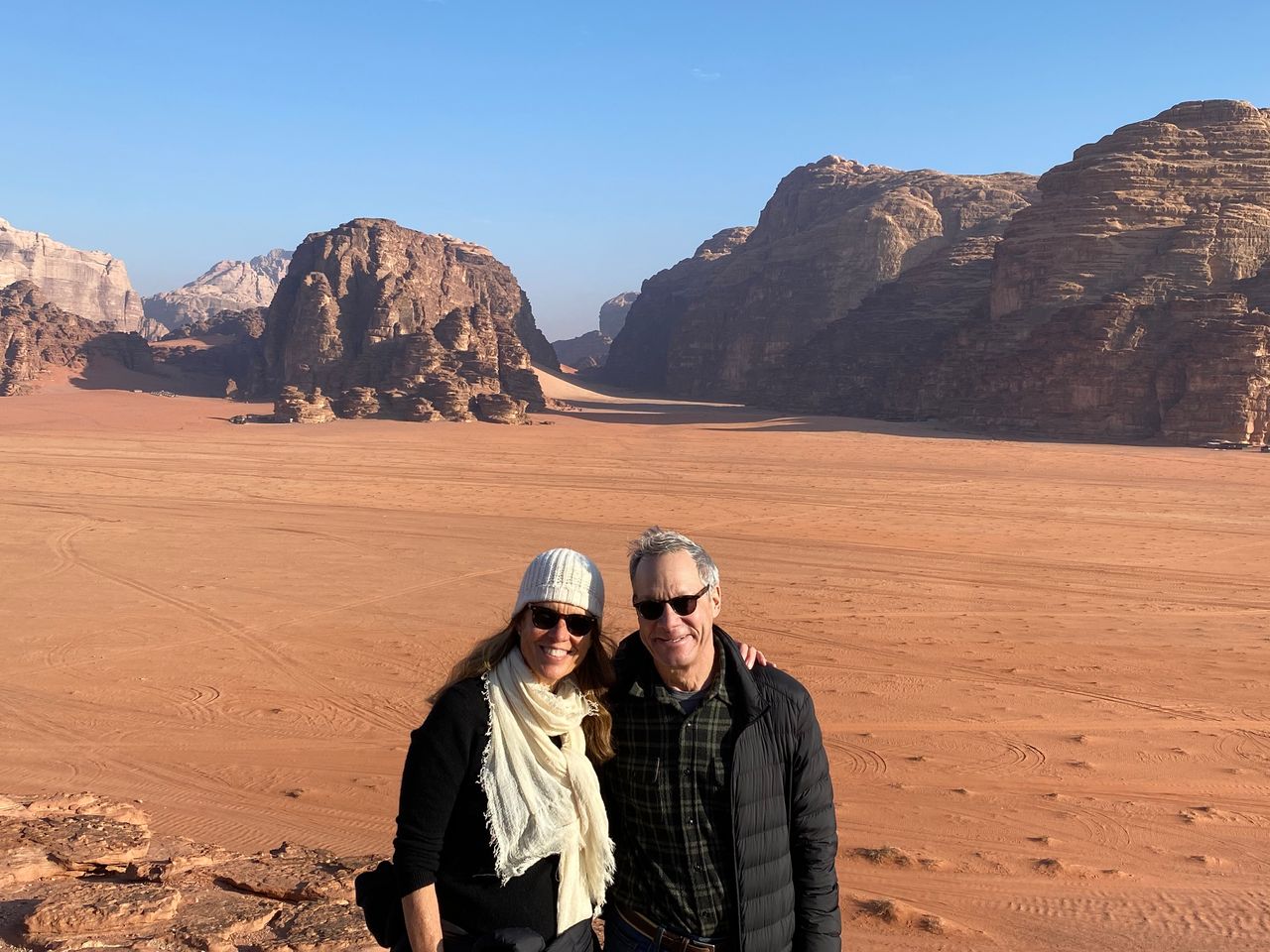 作者與丈夫丹·貝坦庫爾在約旦南部瓦迪拉姆的中東之旅中留影。照片:凱瑟琳·休斯### 擲骰子般的旅行