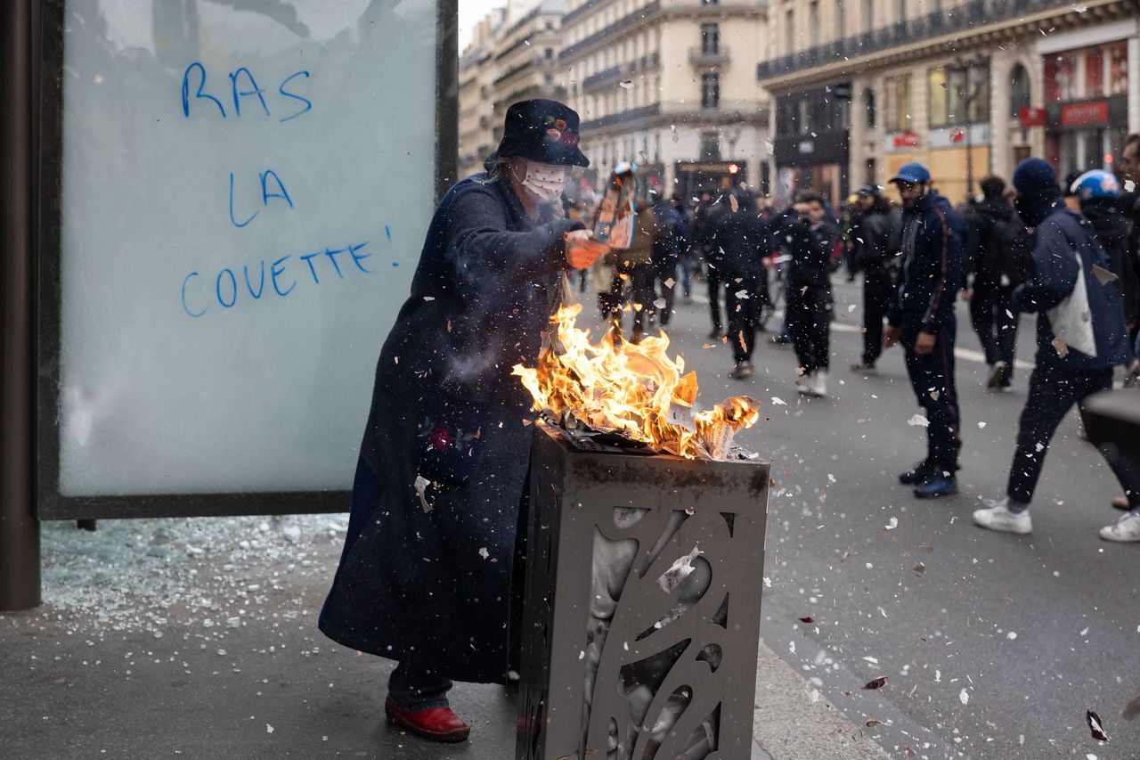 週四在巴黎的一名抗議者。照片:Aurelien Morissard/美聯社週三,馬克龍試圖翻過與工會的鬥爭篇章,此前他的政府在本週早些時候在法國國民議會(下議院)勉強通過了不信任投票。在接受法國電視台採訪時,他表示提高退休年齡符合國家的最佳利益,並將襲擊法國議員辦公室的抗議者比作2021年1月6日衝擊美國國會大廈的人。