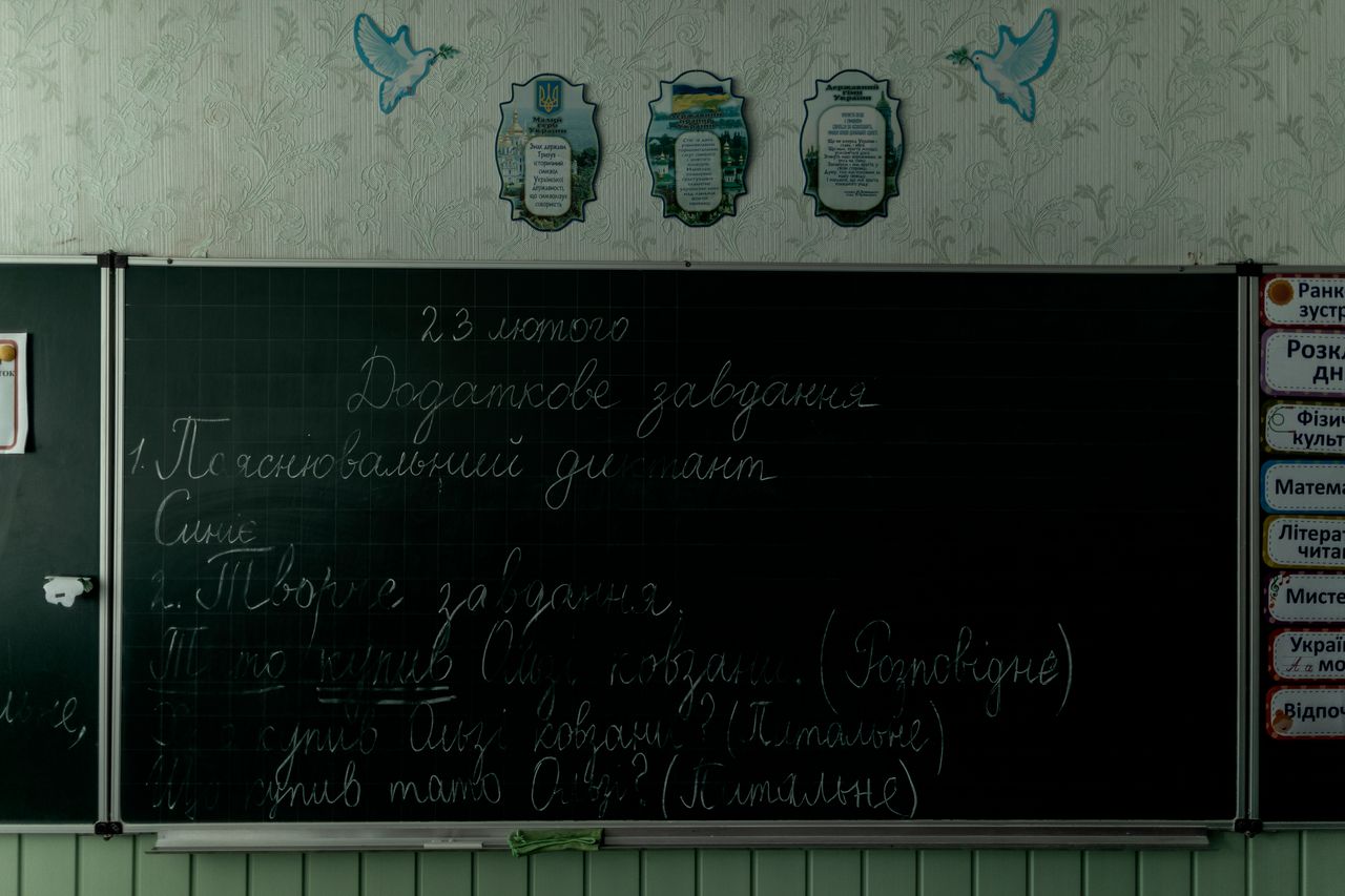 在一所被改造成避難所的學校裏,黑板上還留着俄羅斯全面入侵前一天佈置的作業。
