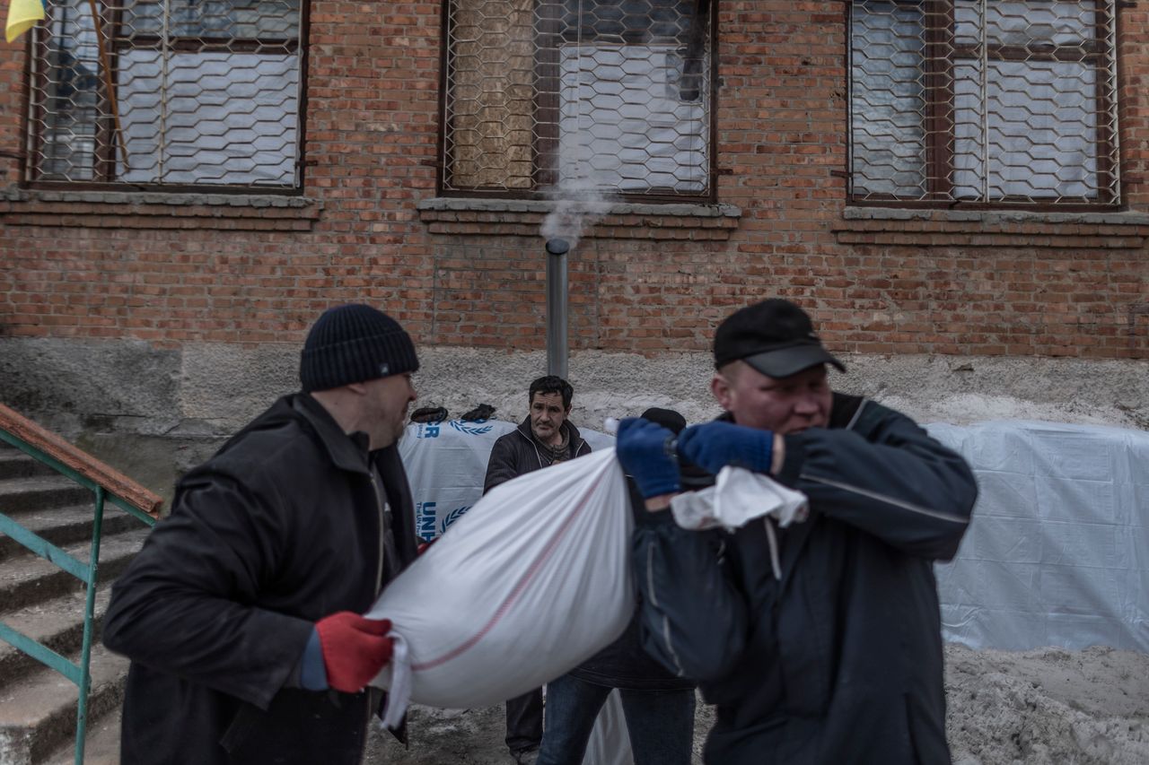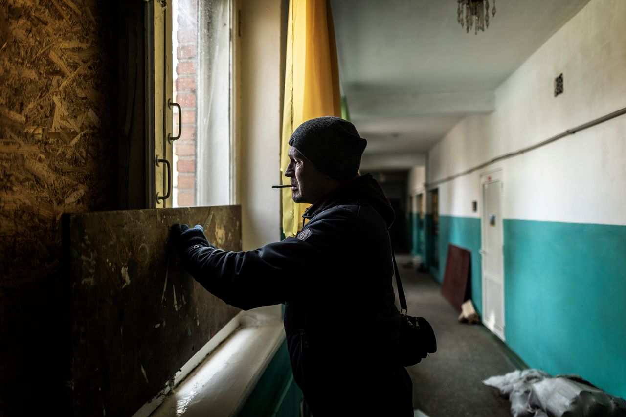 志願者正在加固一所學校的窗户,這裏正在為奧裏希夫的平民建立一個人道主義援助中心。近日,當留守奧裏希夫的少數警察之一瓦迪姆·梅德維德在城裏開車時,他無視烏克蘭炮兵部隊開火的巨響,但一旦俄羅斯多管火箭系統開始還擊,他就急忙躲進避難所。這一次,俄羅斯的火箭彈落在了遠處。