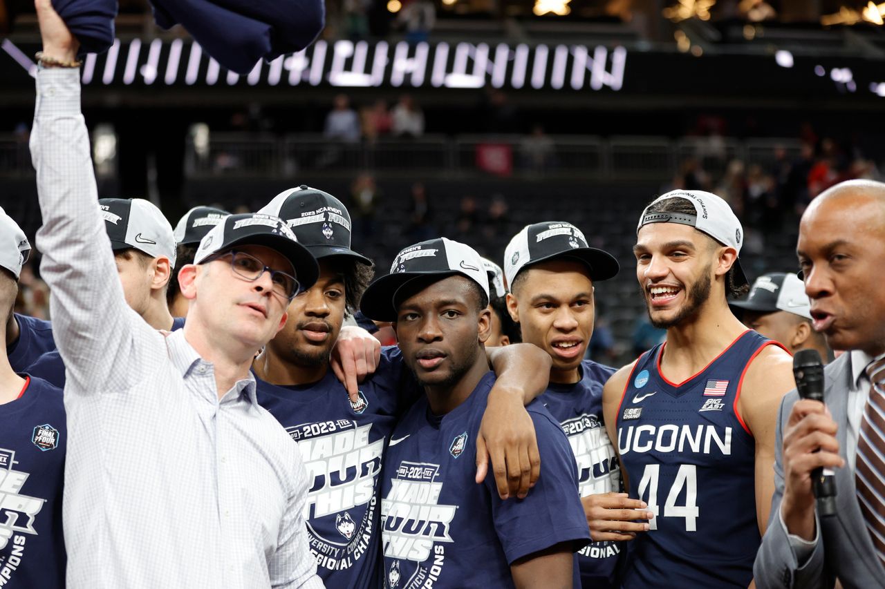 康涅狄格大學教練丹·赫爾利在精英八強賽中擊敗岡薩加鬥牛犬隊後與球員們一起慶祝。照片:卡門·曼達託/蓋蒂圖片社