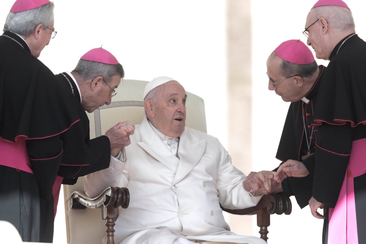 教宗方濟各週三結束每週例行公開接見活動後,在前往醫院前受到主教們的問候。圖片來源:Maria Grazia Picciarella/ROPI/Zuma Press羅馬——梵蒂岡週三表示,教宗方濟各因呼吸道感染住院,需要接受數日治療。