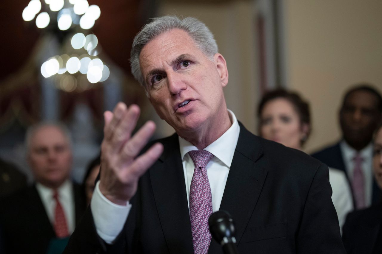 3月24日,眾議院議長凱文·麥卡錫在華盛頓接受記者採訪。圖片來源:J. Scott Applewhite/美聯社刊登於2023年3月31日印刷版,標題為《麥卡錫的債務上限提議》。
