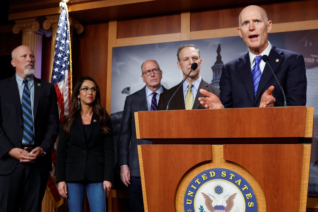眾議員奇普·羅伊(左)與保守派同僚及佛羅里達州共和黨參議員裏克·斯科特上月就國家債務上限問題召開新聞發佈會。圖片來源:JONATHAN ERNST/REUTERS温和派及關注國防的共和黨人已對削減國防開支提出反對。羅伊先生回應稱,可以進一步削減非國防開支以增加國防預算。此類削減可能動搖競爭激烈選區議員的支持。
