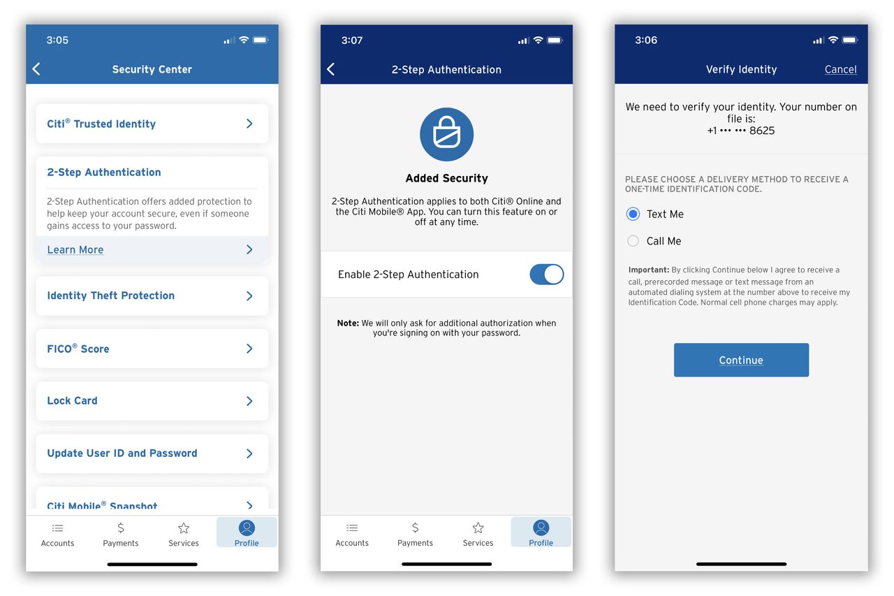 大通用户可為網站登錄啓用一次性驗證碼。照片:DALVIN BROWN/華爾街日報**花旗銀行:**花旗移動應用不會自動要求用户開啓雙重認證。請前往個人資料>安全中心>兩步驗證並啓用該設置。啓用後,登錄時需要接收通過短信或電話發送的一次性代碼。注意:花旗正在更新其移動應用,因此流程可能有所不同。