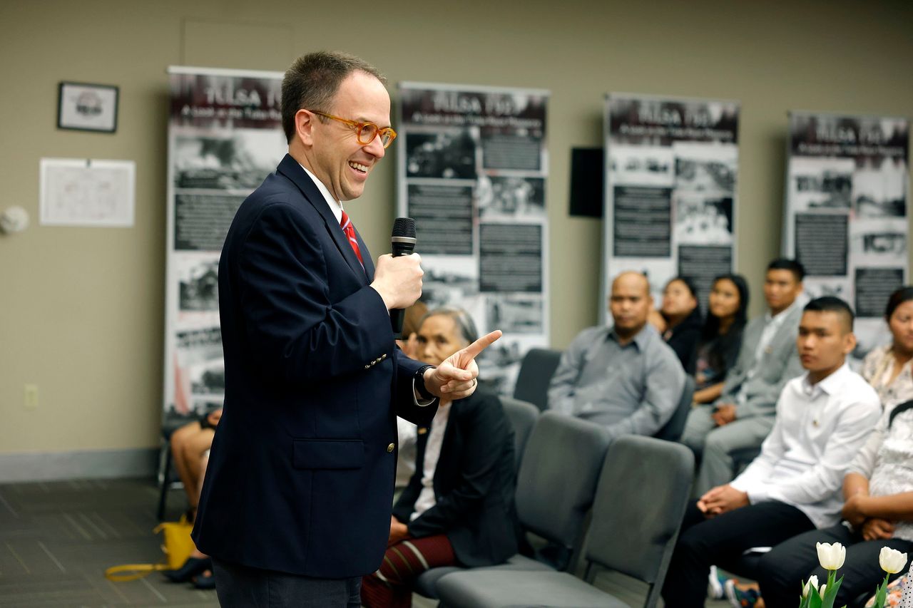 塔爾薩市長G.T. 拜納姆去年在市政廳舉行的入籍儀式上講話。圖片來源:Mike Simons/Tulsa World/Associated Press市長G.T. 拜納姆強調吸引移民到塔爾薩,以此擴大勞動力池並推動這個約40萬人口城市的經濟。大約500名在喀布爾陷落後撤離到美國的阿富汗難民已在塔爾薩重新定居,拜納姆表示,按人均計算,塔爾薩接收的難民數量在美國名列前茅。