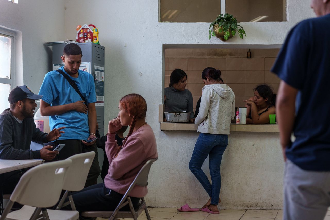 移民們在墨西哥華雷斯城的Buen Samaritano收容所餐廳休息,此前他們嘗試使用CBP One應用程序獲取邊境預約。