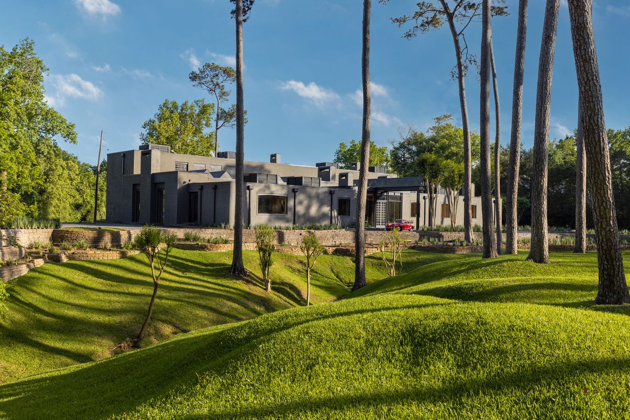 特拉斯先生形容這座位於休斯頓紀念區布法羅河畔僻靜地段的住宅是多種風格的融合體。他表示,這是一棟中世紀墨西哥莊園風格的住宅,帶有密斯式風格的增建部分,並融入了一些賴特式的設計手法。房屋坐落在約4英畝的森林土地上,可俯瞰休斯頓鄉村俱樂部高爾夫球場的景色。