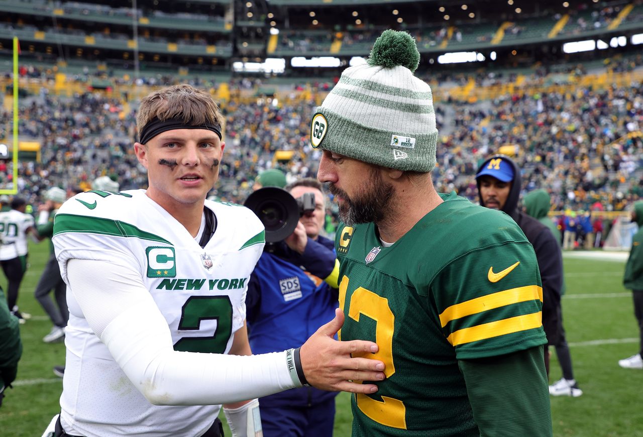 2022年包裝工隊與噴氣機隊比賽後的阿隆·羅傑斯和扎克·威爾遜。圖片來源:Stacy Revere/Getty Images這類附帶條件對兩支球隊並不陌生:2008年包裝工將他們的上一位傳奇四分衞佈雷特·法弗交易至噴氣機時,綠灣獲得的未來選秀權就基於其出場次數和噴氣機季後賽走多遠等因素。(該交易還包含毒丸條款,禁止噴氣機將法弗交易至維京人隊。結果法弗在紐約表現不佳後被裁,直接與明尼蘇達簽約。)