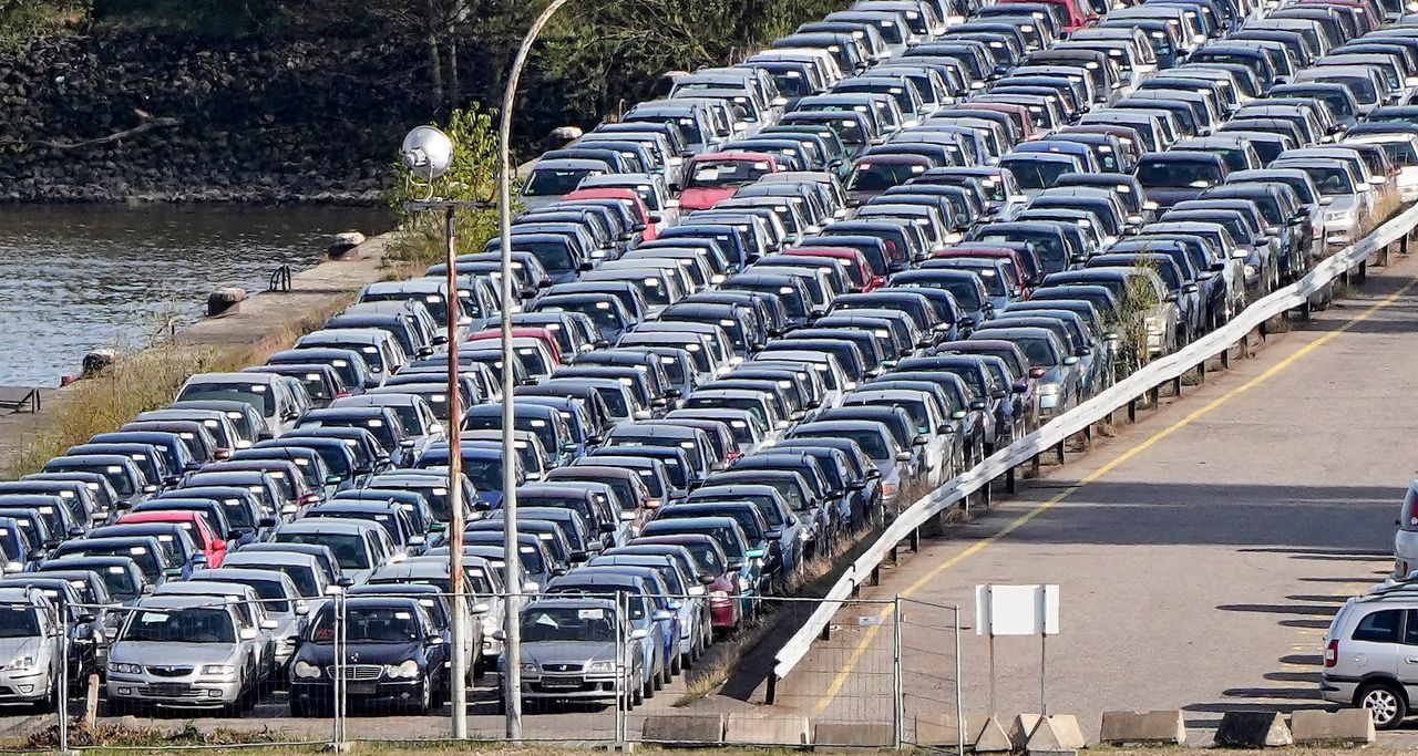 2022年3月18日,德國漢堡集裝箱碼頭存放的內燃機汽車。圖片來源:Martin Meissner/Associated Press刊發於2023年4月21日印刷版,標題為《碳關税戰爭來臨》。