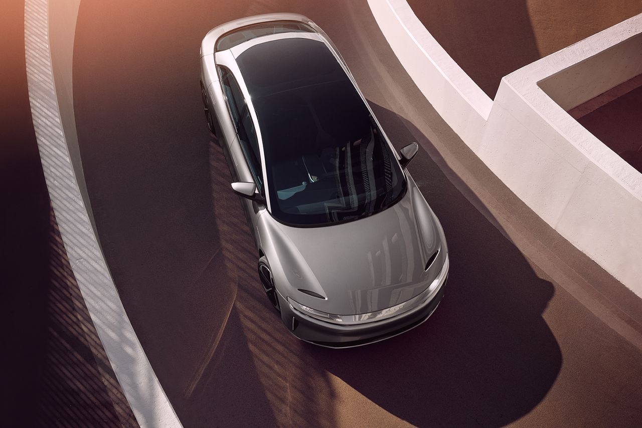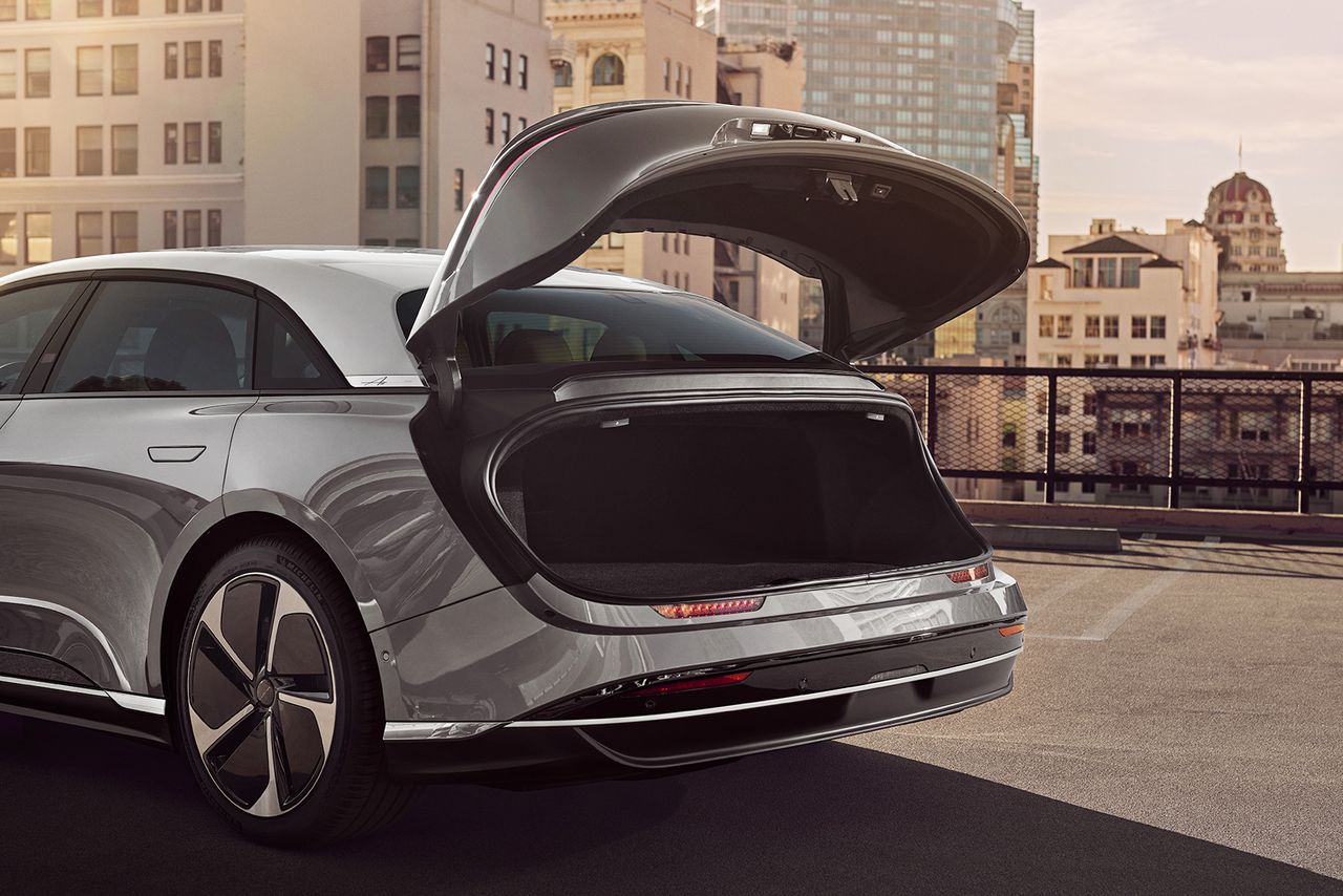 喧囂與獨特 在現代豪華轎車中獨樹一幟,Lucid Air的快背輪廓和短截尾部隱藏着一個寬敞的後備箱,與車廂分離,通過一個類似艙門的大蓋子開啓。照片:LUCID MOTORS基礎價格:107,400美元