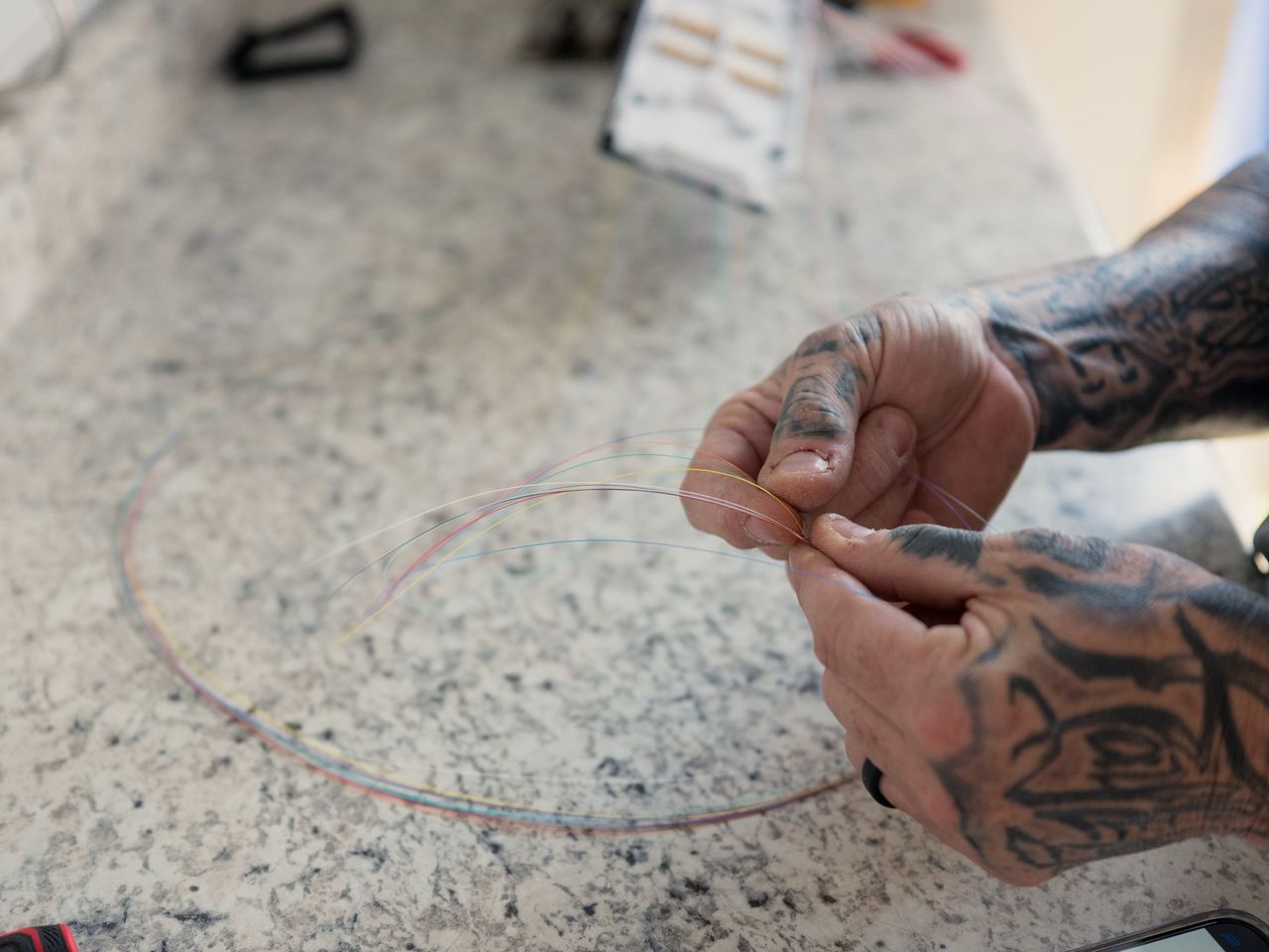 克里斯·馬歇爾手持光纖線纜剝離外皮,為熔接做準備。他奔波於全國各地的工程項目之間。### 提供豐厚獎金