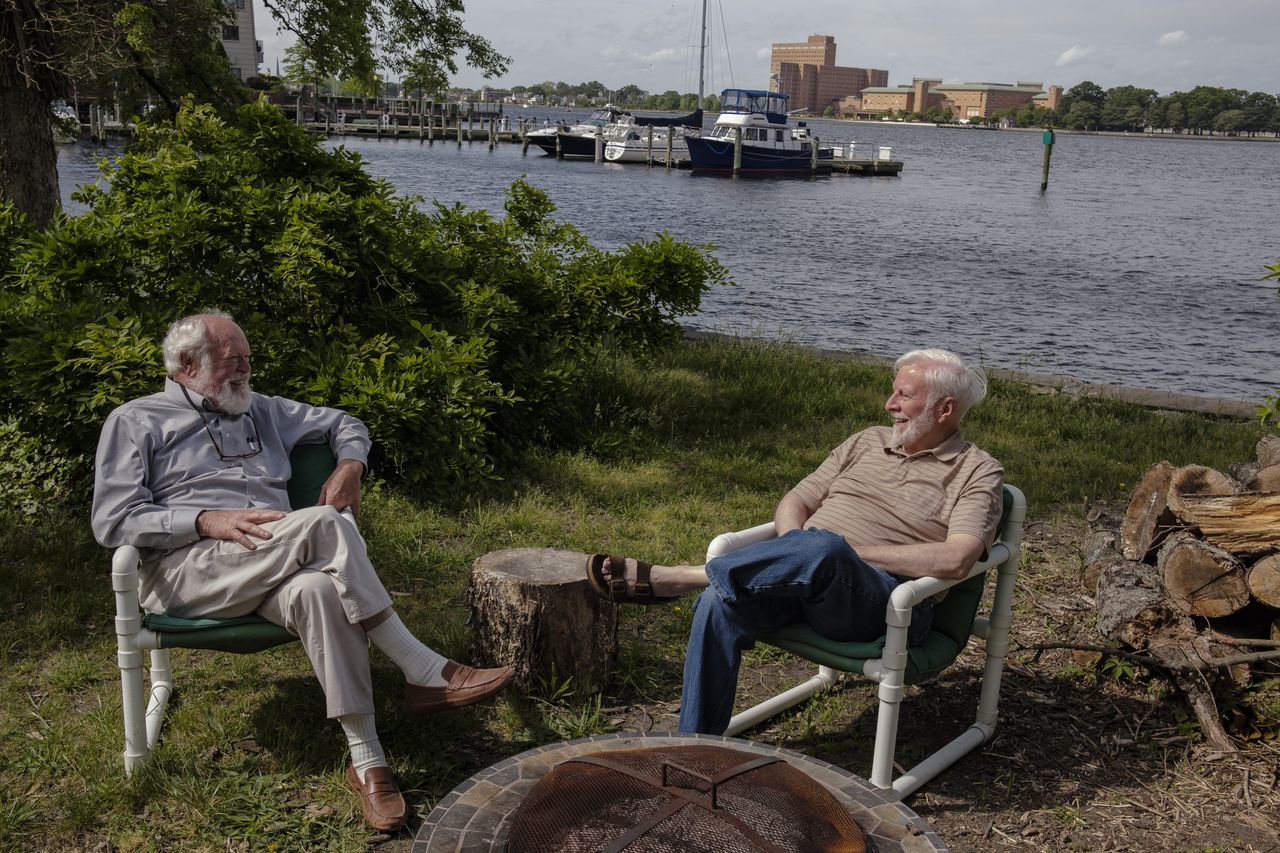 脖子上掛着眼鏡的阿爾·羅珀和吉姆·格曼——兩位都已退休的朋友——對弗吉尼亞州諾福克市一些規劃中的海岸保護項目持不同看法。現年82歲的羅珀醫生大半生都住在水邊一棟建於19世紀初的寬敞住宅裏。他説洪水從未淹到過房子,而且他很高興看到規劃圖顯示新建的海堤位於他的房產內陸一側。