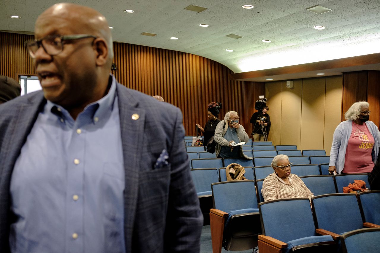 勞倫斯·布朗(本月早些時候在弗吉尼亞州諾福克市議會會議上穿着藍色外套)和坐着的莎倫·亨德里克希望看到在諾福克南區建造實體屏障以抵禦海水侵蝕。
