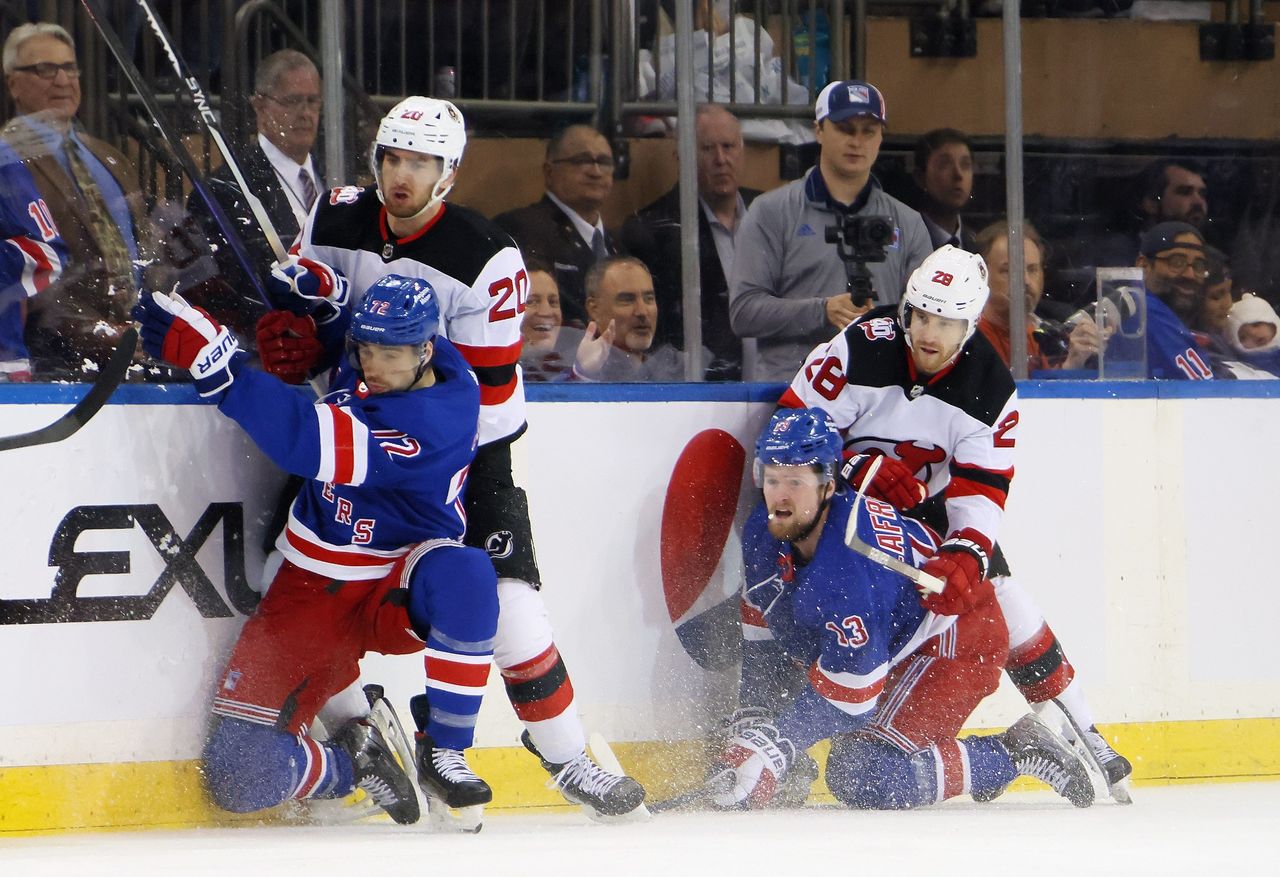 紐約遊騎兵隊的菲利普·希蒂爾和阿列克謝·拉夫倫尼爾遭到新澤西魔鬼隊的邁克爾·麥克勞德和達蒙·塞弗森的攔截。圖片來源:布魯斯·貝內特/Getty Images刊登於2023年4月26日印刷版,標題為《快速重建使遊騎兵與魔鬼隊再次成為季後賽對手》。