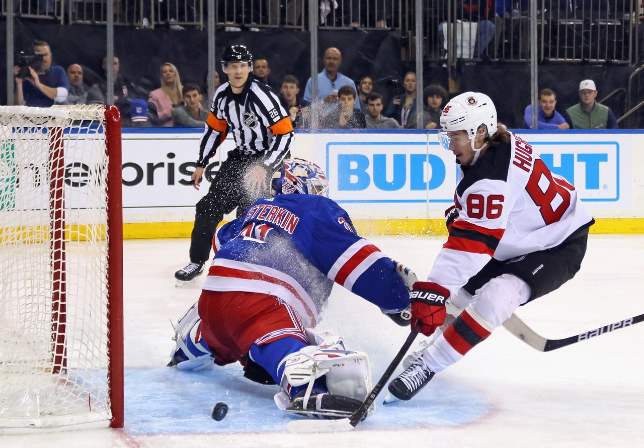 新澤西魔鬼隊的傑克·休斯在季後賽首輪第四場比賽中攻破紐約遊騎兵隊門將伊戈爾·謝斯特金的球門。圖片來源:布魯斯·貝內特/蓋蒂圖片社過去五年的大部分時間裏,無論是紐約遊騎兵隊還是他們在哈德遜河對岸的對手新澤西魔鬼隊,都未能打出配得上總冠軍的冰球水平。兩支球隊都陷入低谷,囤積着NHL的高順位選秀權而非季後賽勝利,渴望着更好的日子。