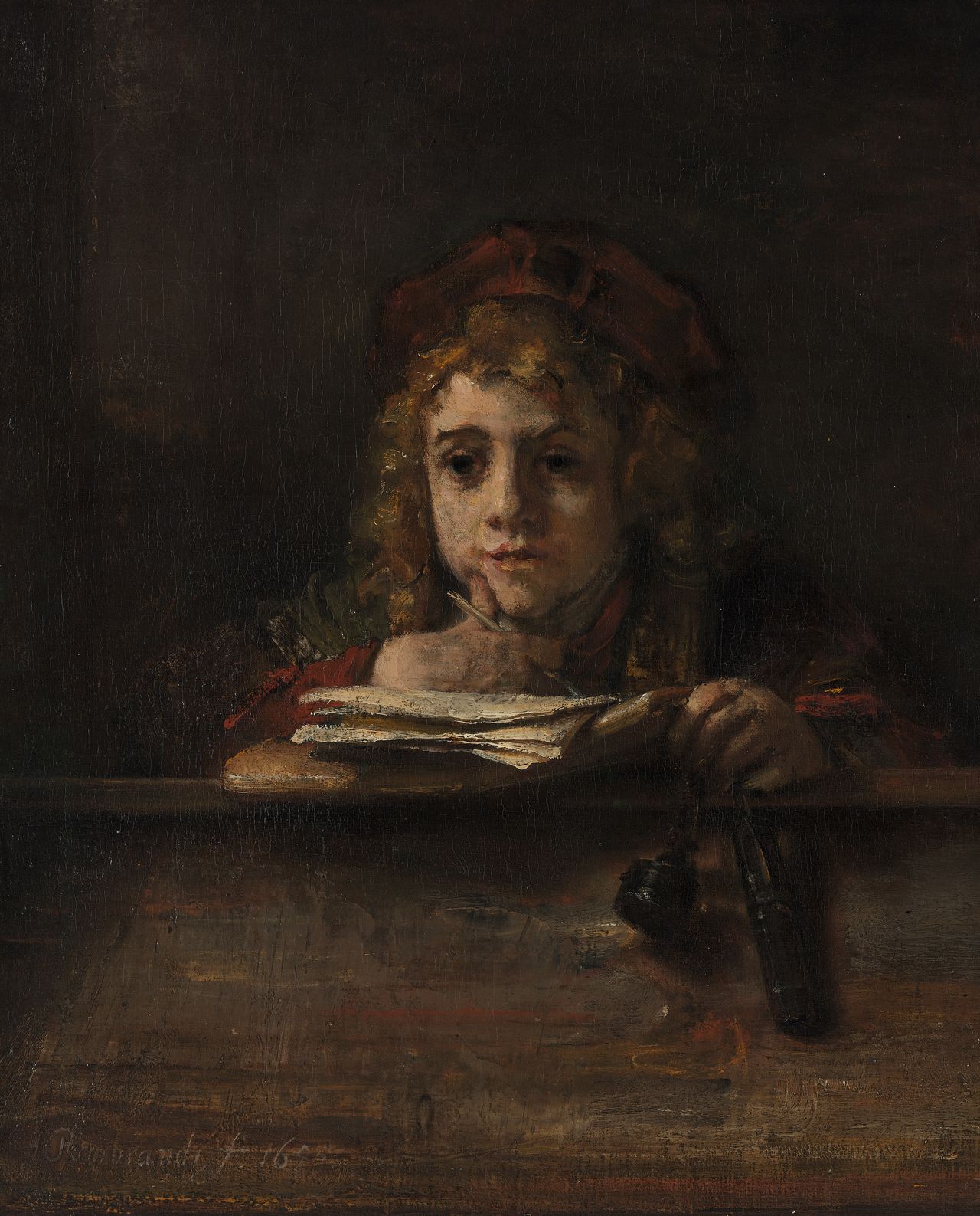 《桌前的提圖斯》(1655年)圖片來源:倫勃朗故居博物館第二場展覽《提圖斯歸家:兒子、父親與傑作》僅展出一幅畫作——倫勃朗1655年在此創作的温情肖像《桌前的提圖斯》,現由鹿特丹博伊曼斯·範伯寧恩美術館借展。當光線灑落在這位神情恍惚的少年臉龐上時,他凝視着空中而非面前堆積的紙張,手握墨水瓶與筆盒,彷彿在思索接下來該寫什麼或畫什麼。凝視這幅畫時,我恍若感受到倫勃朗親自邀我步入的不僅是他的家,更是他的精神世界,讓我對其永恆藝術有了更深層的領悟。