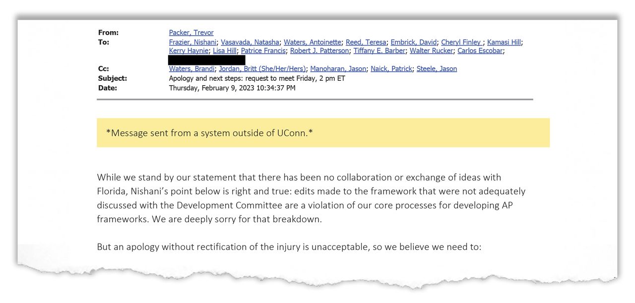 大學理事會的回覆來自自2003年起負責AP項目的特雷弗·帕克。“雖然我們堅持我們的聲明,即與佛羅里達州沒有合作或交流,”他説,“但尼沙尼下面的觀點是正確的:對框架進行的修改沒有與開發委員會充分討論,這違反了我們的核心開發流程。我們對這一失誤深感抱歉。”