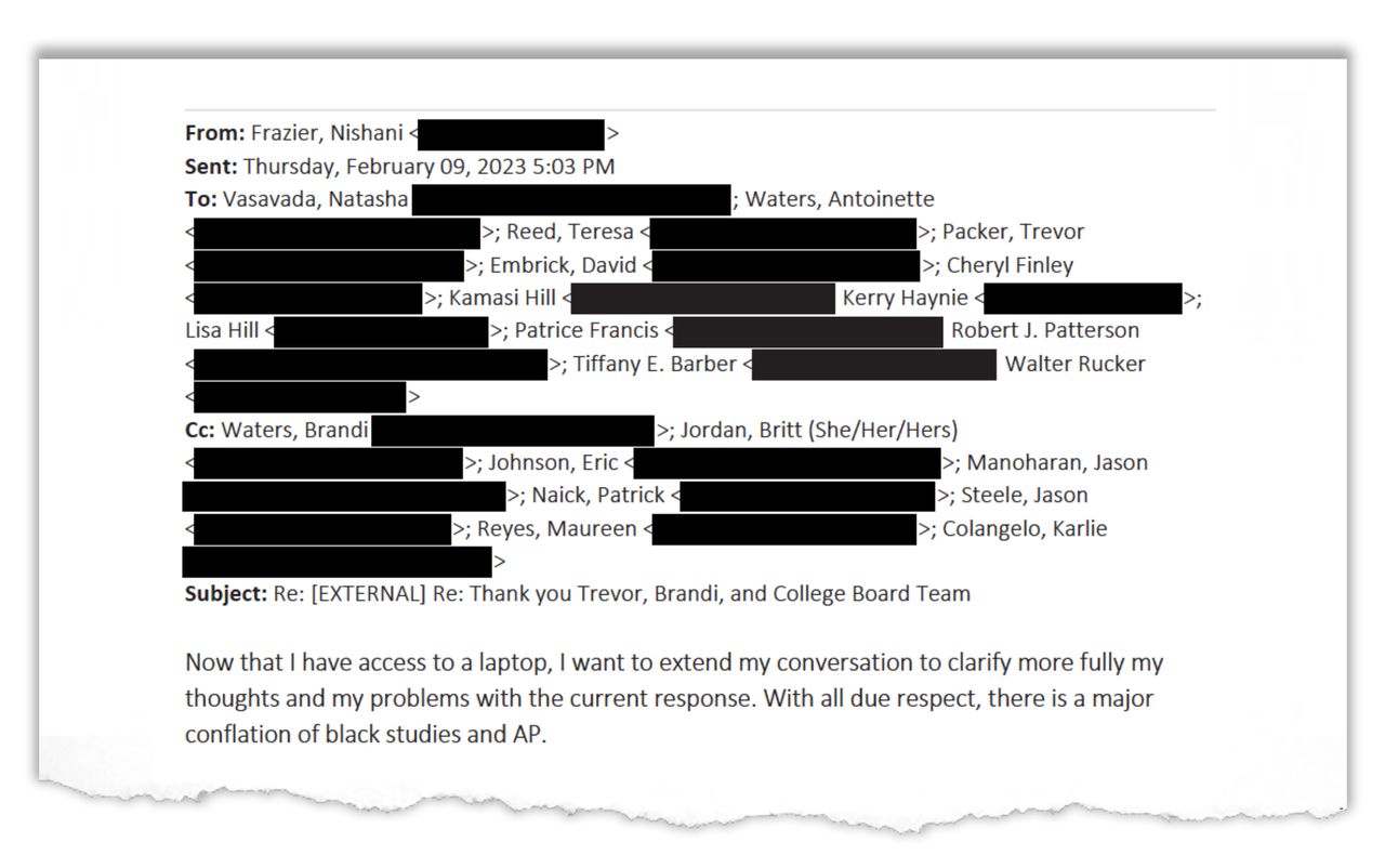 然而,根據我們通過公開記錄法獲得的電子郵件,其自己的教師顧問私下批評這是不誠實的宣傳。“我耐心且安靜地觀看了無處不在的採訪和媒體斷言,即AP不會在教授、教師和學生之外的任何團體的要求下做出改變,”堪薩斯大學教授尼沙尼·弗雷澤寫道,她是AP課程發展委員會的成員。“如果是這樣,那麼是哪個學生、教授或教師建議在課程中加入黑人保守派,而不是康巴希河集體?”