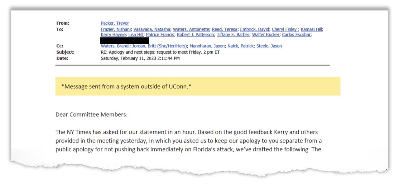 大學理事會在這件事上一直不夠坦誠。兩天後,帕克先生向委員會成員發送了一份聲明草案。他表示,草案措辭吸納了委員們的"寶貴意見",即"要求將對委員們的致歉與未立即反駁佛羅里達州攻擊行為的公開道歉分開處理"。