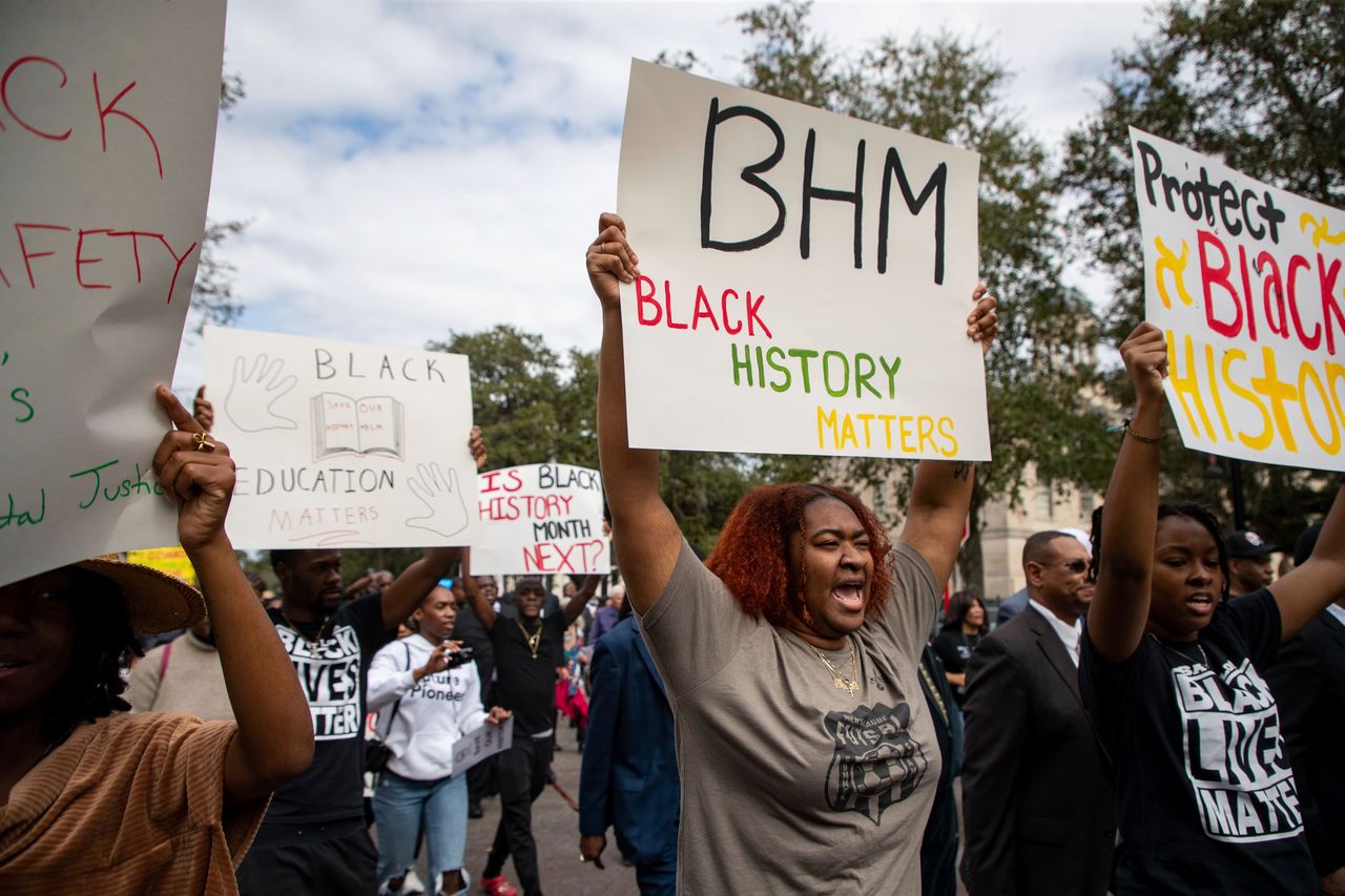 數百人蔘加全國行動網絡集會,抗議州長羅恩·德桑蒂斯否決高中非裔美國人歷史課程,塔拉哈西,2月15日。圖片來源:艾麗西亞·迪瓦恩/美聯社刊載於2023年4月27日印刷版,標題為《大學理事會的秘密道歉》。