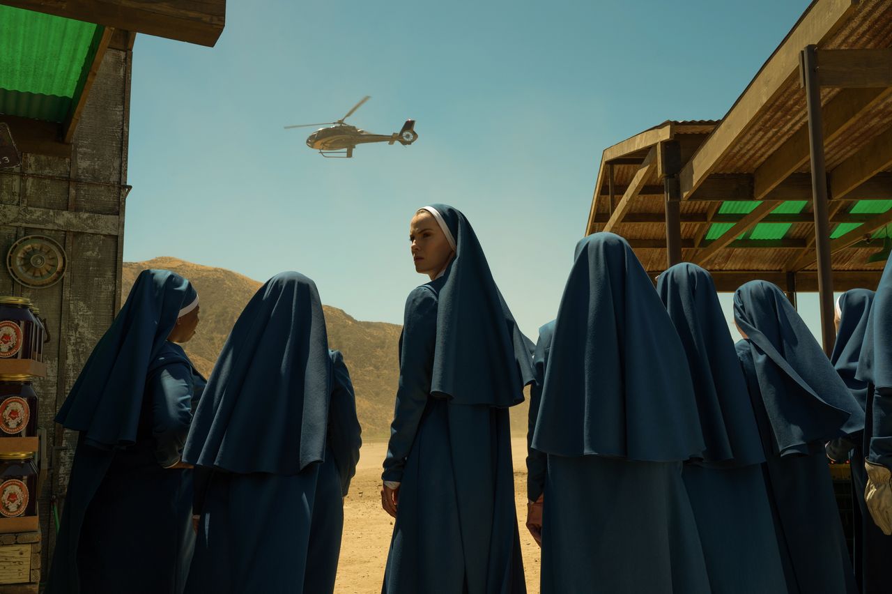 **埃爾南德斯:**修女感覺像是AI的天然對立面,但我不想讓它成為一種簡單的裝扮。我可以欣賞《音樂之聲》,但我更感興趣的是真正將瑪麗亞帶入修道院的原因。我們絞盡腦汁思考如何讓這種描繪更易引起共鳴。在與達蒙的通話中,我提出了一個關於信仰浪漫化版本的構想。當西蒙尼祈禱時,她發現自己在一家法拉費餐廳裏遇到了一個男人……