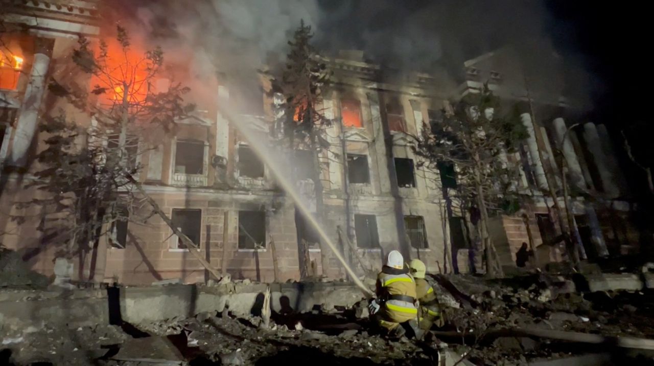 這張圖片來自週四發佈的視頻,展示了烏克蘭尼古拉耶夫市一棟公寓樓遭襲後消防員撲救大火的場景。圖片來源:烏克蘭國家緊急服務部門/路透社
