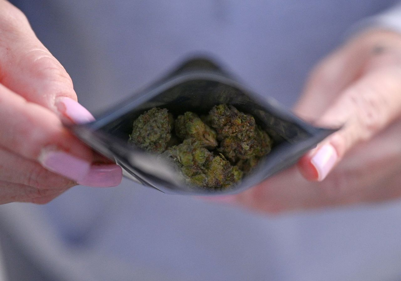 一名顧客展示她在洛杉磯市界以東無證大麻店購買的"花苞”(即大麻花蕾)。圖片來源:Robyn Beck/法新社/蓋蒂圖片社邁克爾·博伊斯警探表示,他負責的洛杉磯警察局大麻執法組經常查處非法店鋪,但這就像打地鼠遊戲。洛杉磯警方稱已鎖定77家無證零售店。