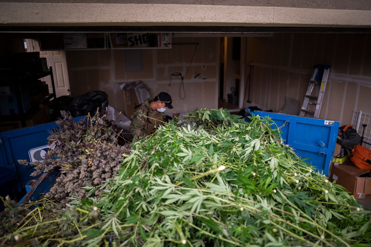 在這個寧靜的灣區郊區,經過一上午打擊非法種植者的行動,警員們將查獲的植物堆滿早已超載的拖車。一名探員在植物堆上跳上跳下,試圖騰出更多空間。