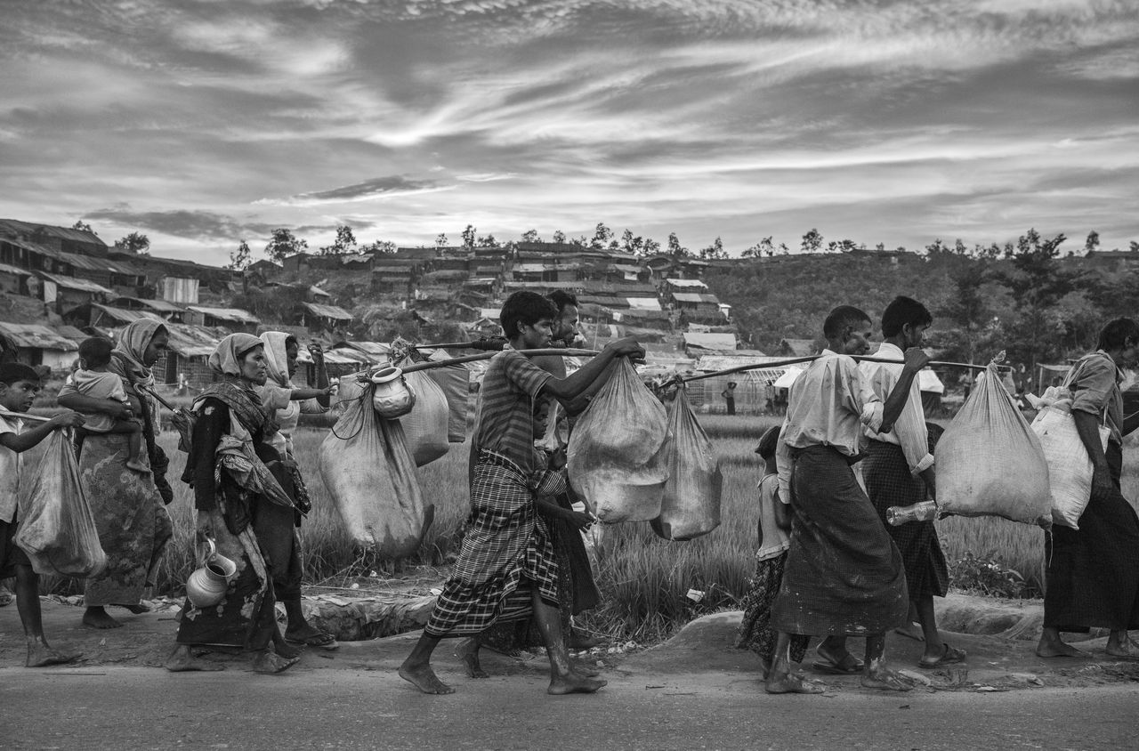 ***一次性使用*** 2017年10月2日,羅興亞難民攜帶家當走在路上,他們從緬甸逃至孟加拉國科克斯巴扎爾的帕朗卡里難民營。攝影:凱文·弗雷耶/蓋蒂圖片社位於科克斯巴扎爾以南20多英里處的庫圖帕隆難民營,是孟加拉國海濱度假小鎮兼地區行政中心所在地,按人口計算為全球最大難民營。百萬羅興亞人擠在五平方英里的污水溝、棚屋和貧民窟中。艾哈邁德先生表示,自建立以來,這個無序擴張、不斷膨脹的難民營已成為羅興亞人"以民族形式存在"的唯一家園。