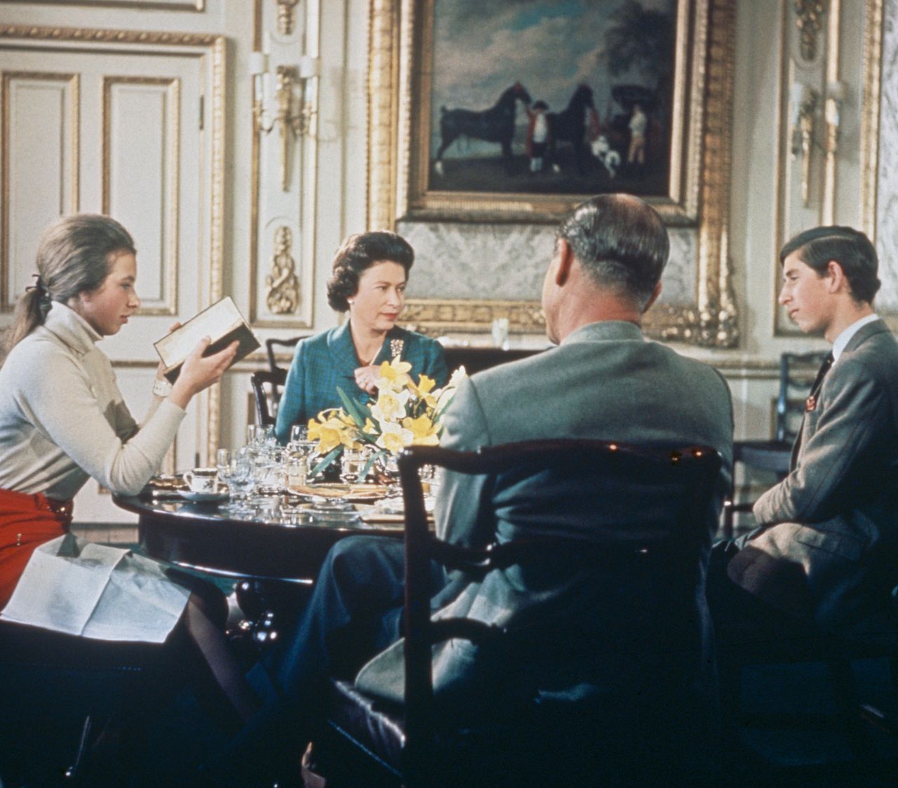 約1969年,伊麗莎白二世女王與菲利普親王及子女安妮公主、查爾斯王子在温莎城堡共進午餐。圖片來源:霍頓檔案館/蓋蒂圖片社### 王座背後
