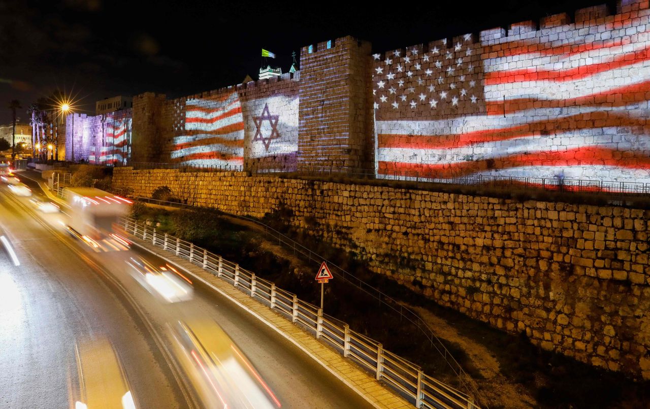 2020年2月11日,耶路撒冷老城城牆上投射着以色列和美國國旗。圖片來源:ahmad gharabli/法新社/蓋蒂圖片社刊登於2023年5月16日印刷版,標題為《75歲的以色列:面臨威脅但依然強大》。